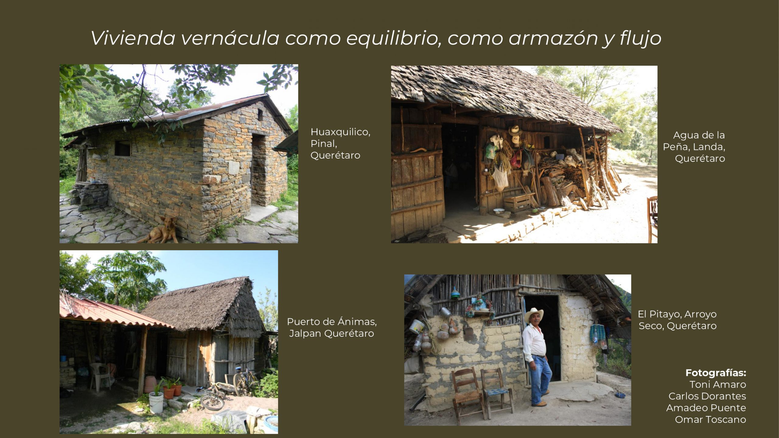 Agua Zarca, Landa, Querétaro, muestra el equilibrio, la contienda entre la voluntad humana y las fuerzas de la naturaleza. En Agua de la Peña, la vivienda es de madera y bahareque, la construcción conserva el fogón. Objetos que cuelgan con los que se cocina, tres fotografías de la misma vivienda tomadas en junio, septiembre y noviembre, muestran el cambio de verdor de la techumbre y la altura del techo; En Huaxquilico, la vivienda es en parte de piedra, hay elementos y enseres domésticos que cuelgan del techo; en El Pitayo, la vivienda de la imagen es un espacio semiabierto; En el pitayo, es característico de lo propio lo personal de la familia; Puerto de Ánimas, es interesante que al estar cercano a la ciudad cambian las características y los objetos que ahí se encuentran, muros de piedra de reuso (cascajo de construcción), láminas de metal, se inicia el uso de materiales industrializados como el alambre recocido para los amarres y reuso de otros materiales; en El pitayo, Arroyo Seco teja, bahareque de olote, amarres con materiales naturales.